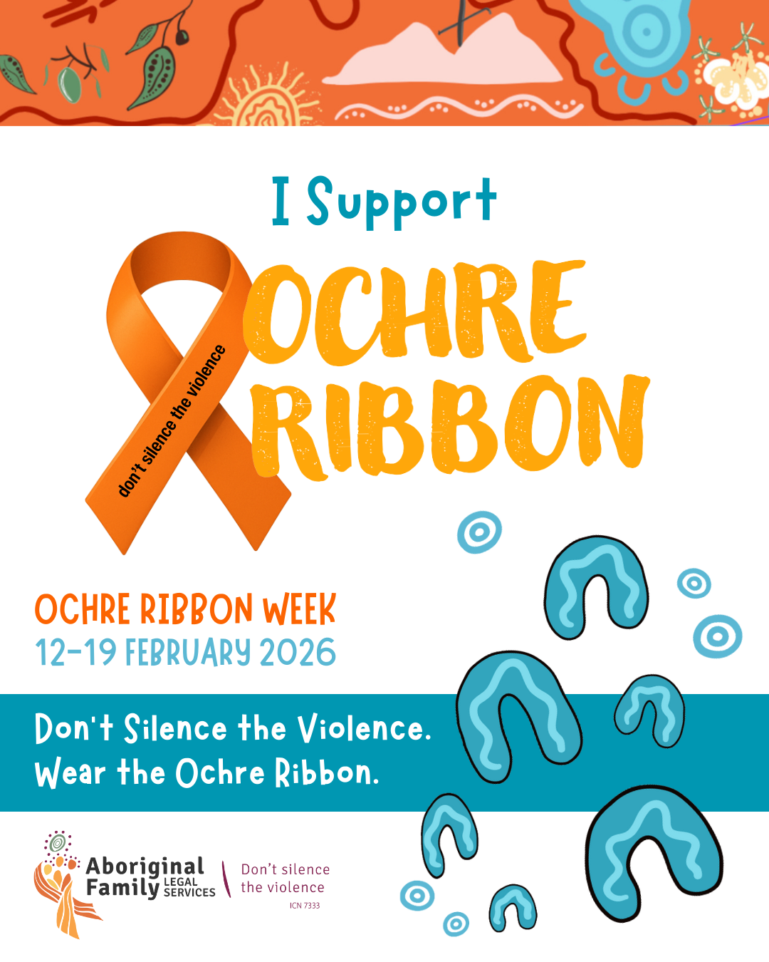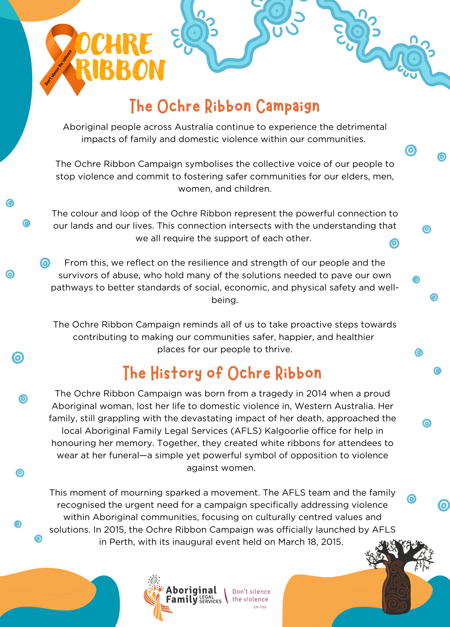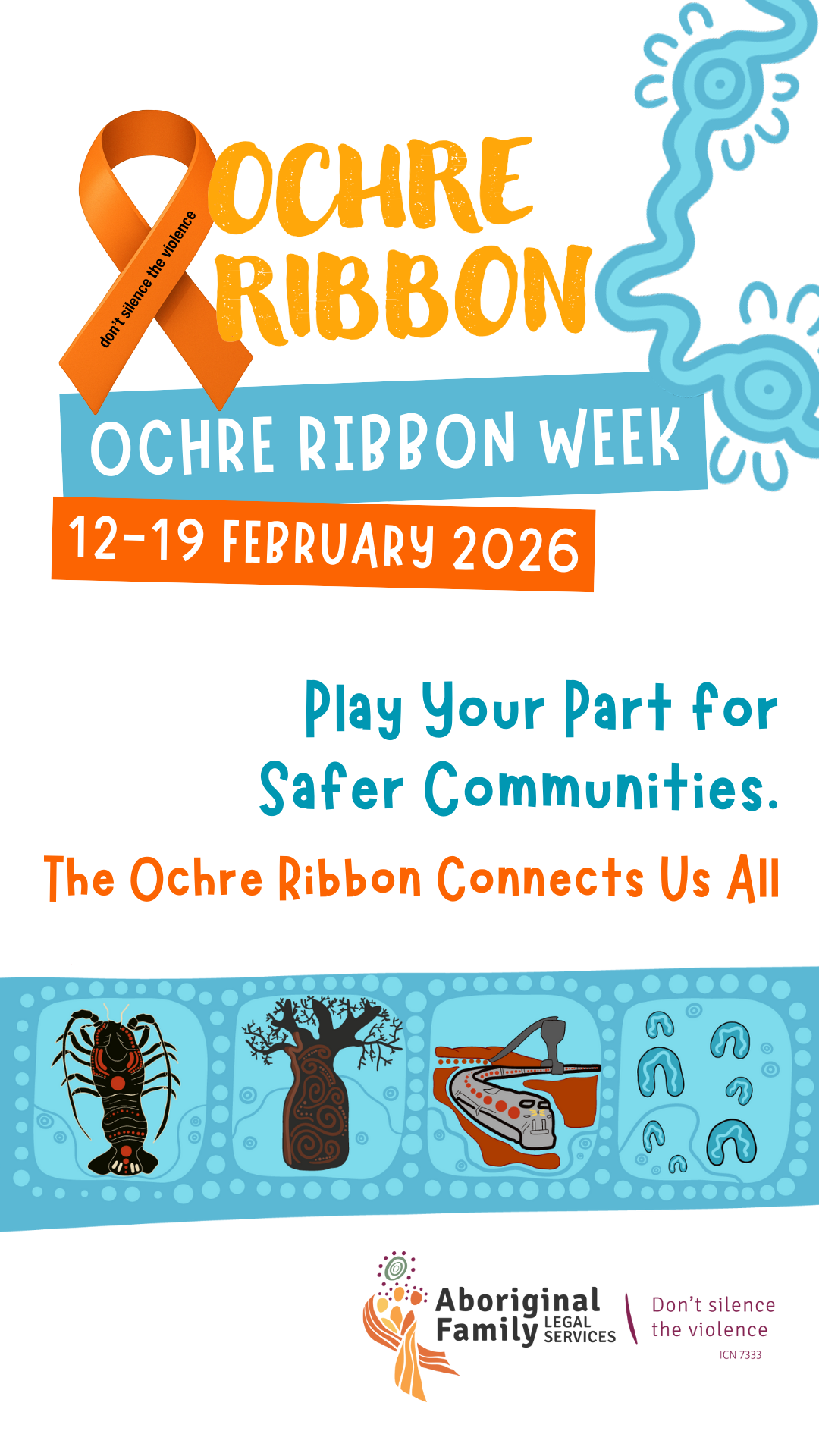 The Ochre Ribbon Campaign was born from a tragedy in 2014 when a proud Aboriginal woman, lost her life to domestic violence in Meekatharra, Western Australia. Her family, still grappling with the devastating impact of her death, approached the local Aboriginal Family Legal Services (AFLS) Kalgoorlie office for help in honouring her memory. Together, they created white ribbons for attendees to wear at her funeral—a simple yet powerful symbol of opposition to violence against women.